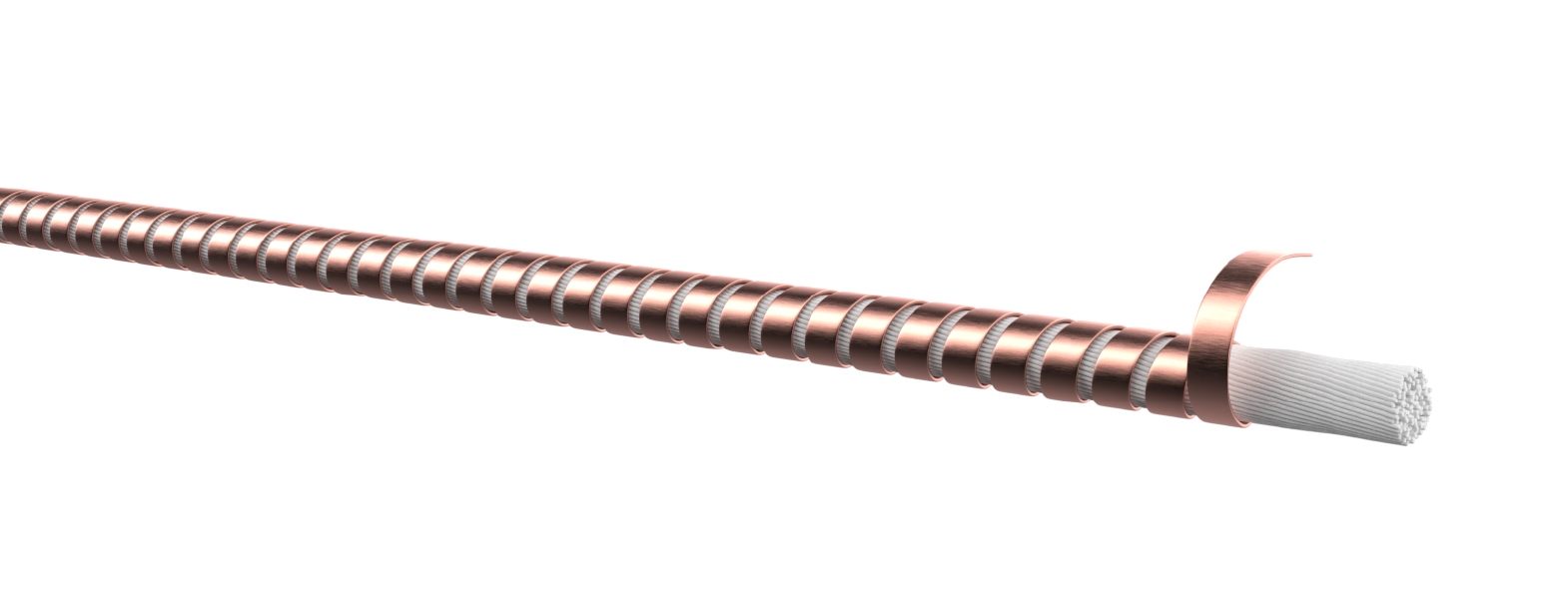 Ein mit Kupfer-Flachdraht einfach oder zweifach umsponnener Trägerfaden.
